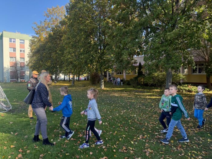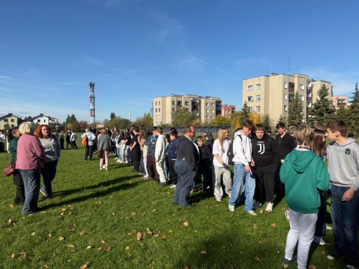 Po usłyszeniu sygnału alarmowego wszyscy uczniowie wraz z nauczycielami opuścili sale lekcyjne i udali się na wyznaczone miejsce zbiórki czyli boisko szkolne. Cała akcja przebiegła sprawnie, spokojnie i bezpiecznie, zgodnie z obowiązującymi zasadami.