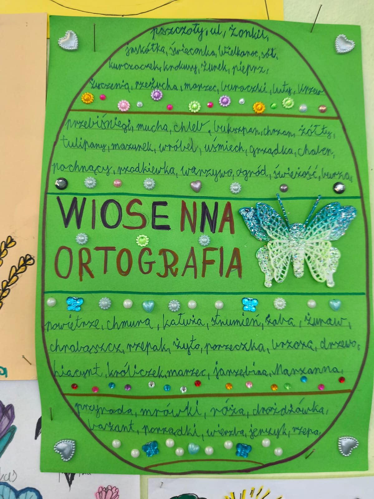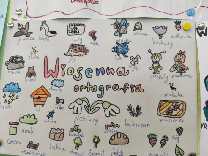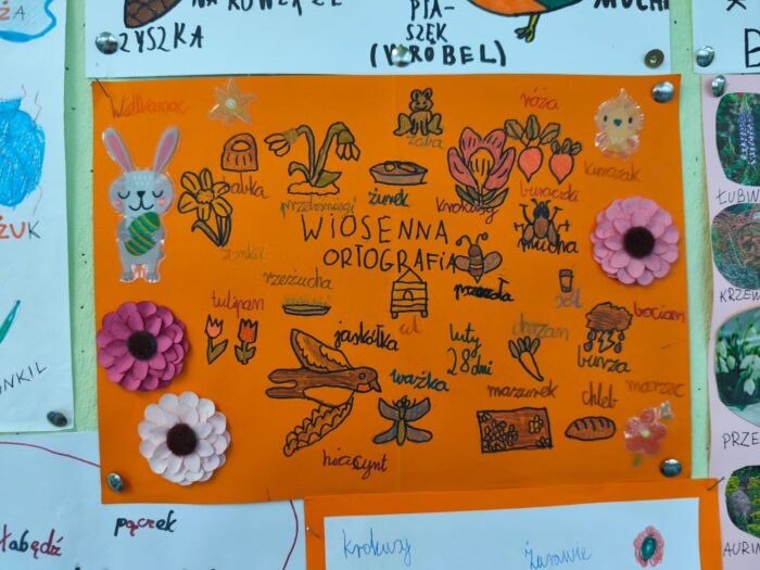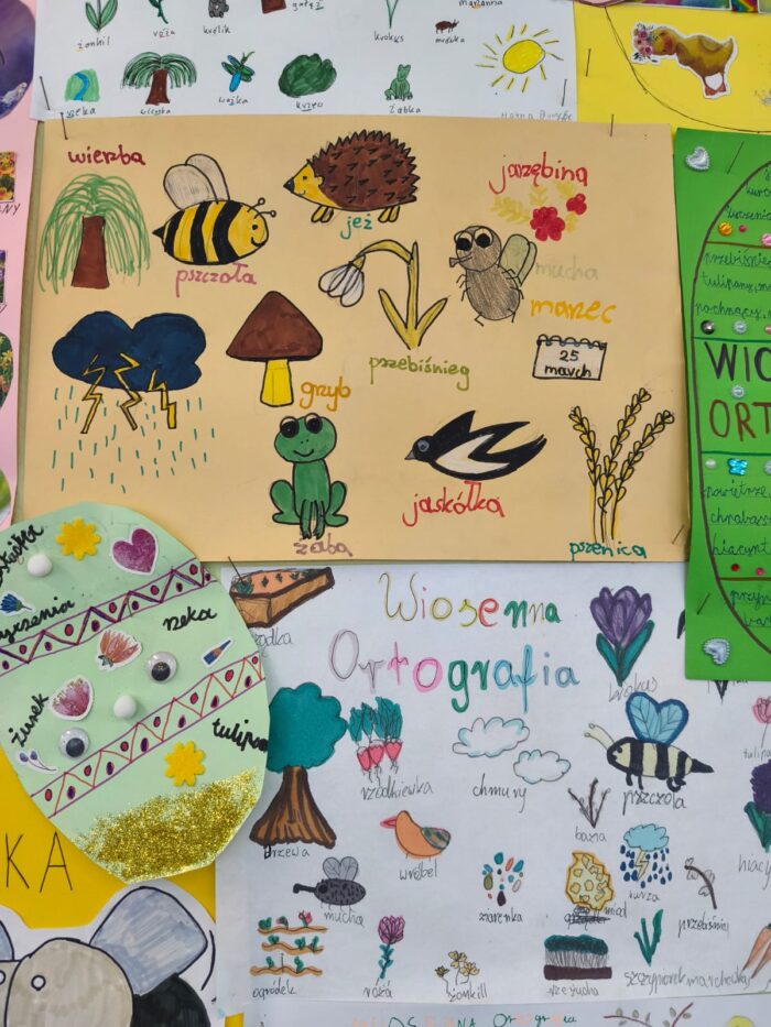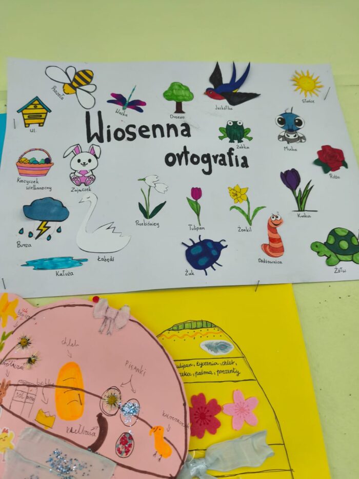 Klasa 4a i 5 c na lekcjach j臋zyka polskiego wykona艂a przepi臋kne prace ortograficzne o tematyce wiosennej i 艣wi膮tecznej.