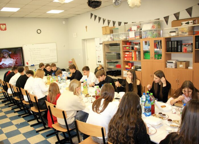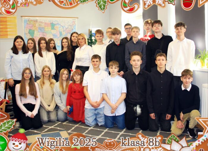 W dniu 17 grudnia odbyło się uroczyste spotkanie opłatkowe wychowawczyni klasy 8b, pani Marioli Sobeckiej-Drozdy, z uczniami klasy 8b. Spotkanie miało świąteczny i podniosły charakter. Uczniowie wspólnie dzielili się opłatkiem oraz składali sobie życzenia. Na świątecznym stole znalazły się tradycyjne potrawy i wypieki, takie jak barszcz, krokiety, pierogi, pierniki oraz ciasta, przygotowane przez uczniów i rodziców.