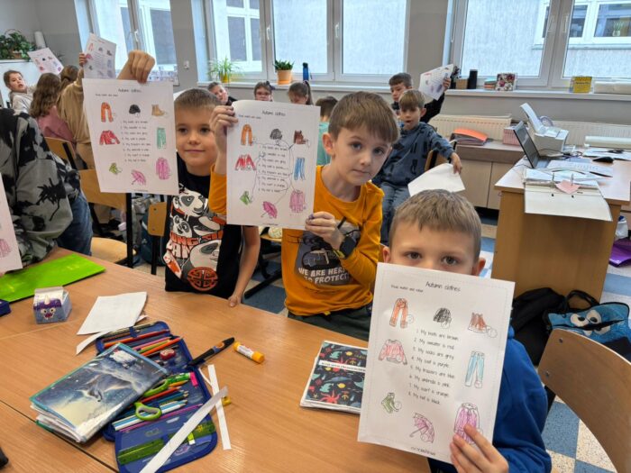 Zajęcia w klasach językowych 2b oraz 2c w temacie ubrań jesiennych. Dzieci miały możliwość utrwalić nazwy ubrań, które noszą jesienią oraz nazwy zwierzątek które mogą spotkać jesienią w lesie . Dzieci wykonywały swoje własne jesienne liście , powtarzały nazwy kolorów oraz tego co jest ukryte jesienią w lesie czy parku , jak kasztany, szyszki, żołędzie .