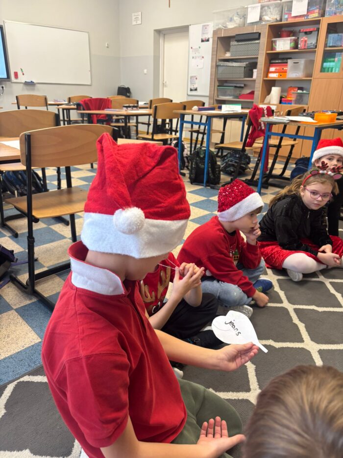 W środę w 6c odbyło się spotkanie przedświąteczne. Były smakołyki, opłatek, życzenia i już świąteczny klimat. Było również kolędowanie przy akompaniamencie ukulele. Były też świąteczne zadania. Poczuliśmy klimat Bożego Narodzenia.